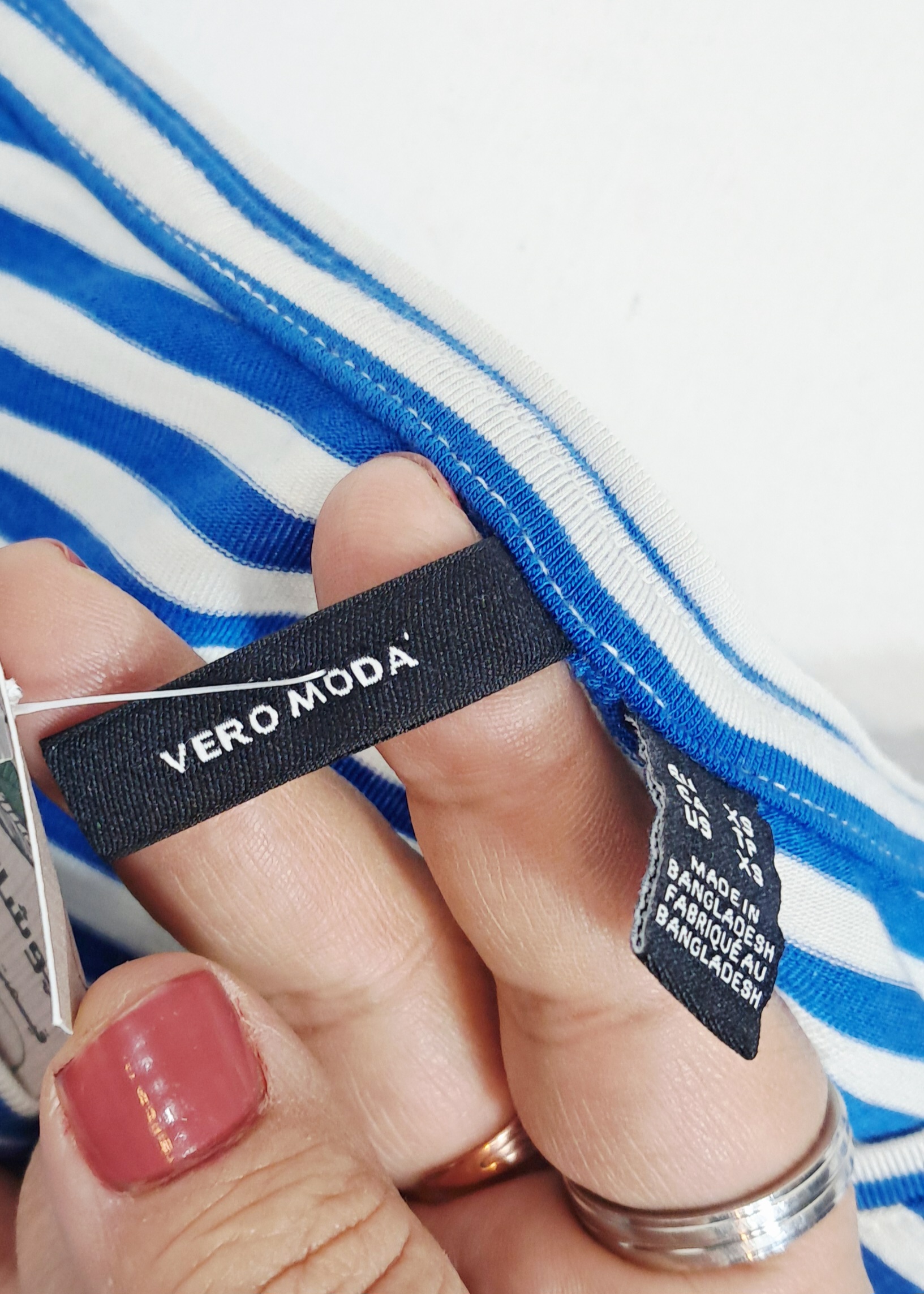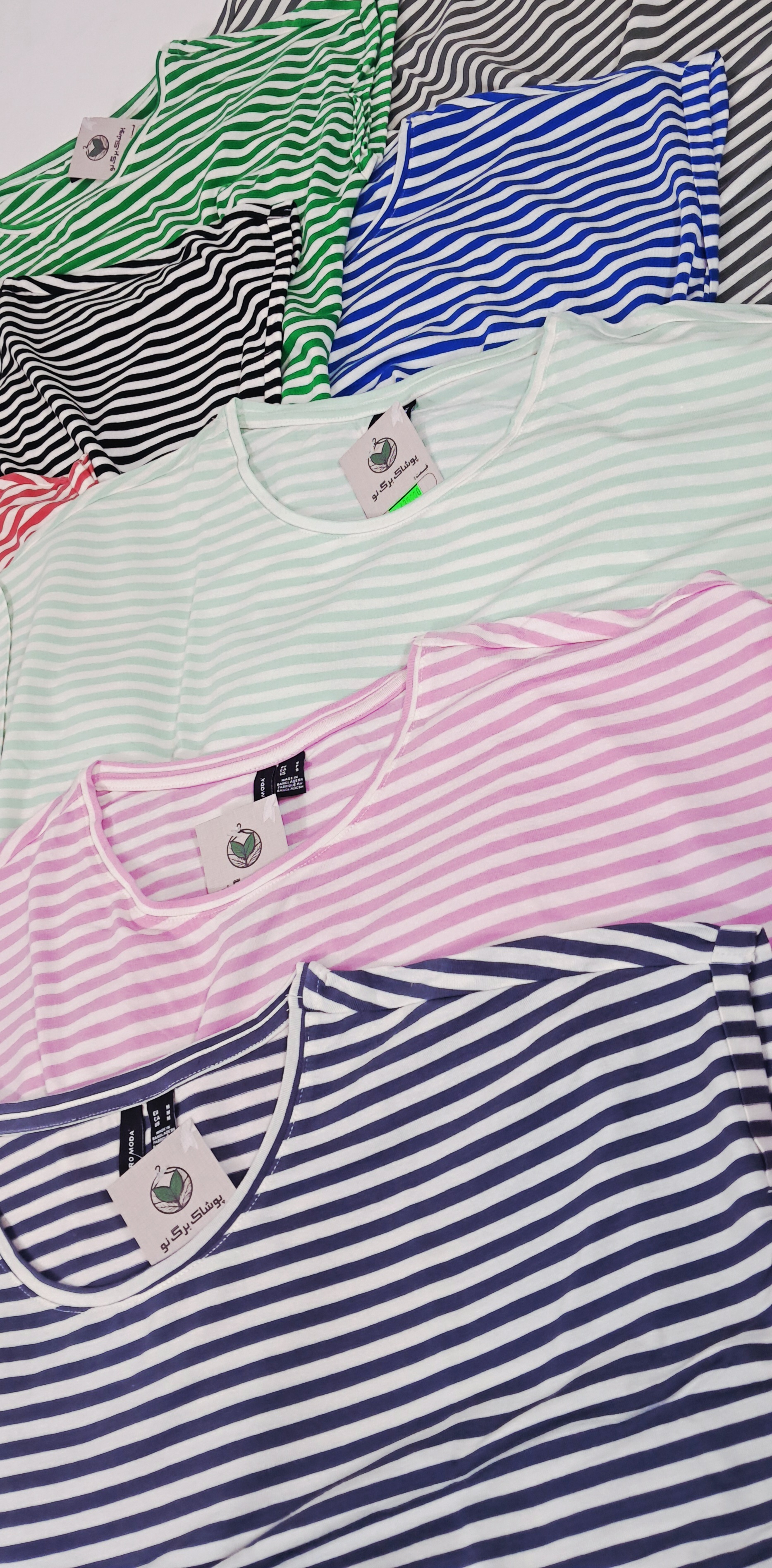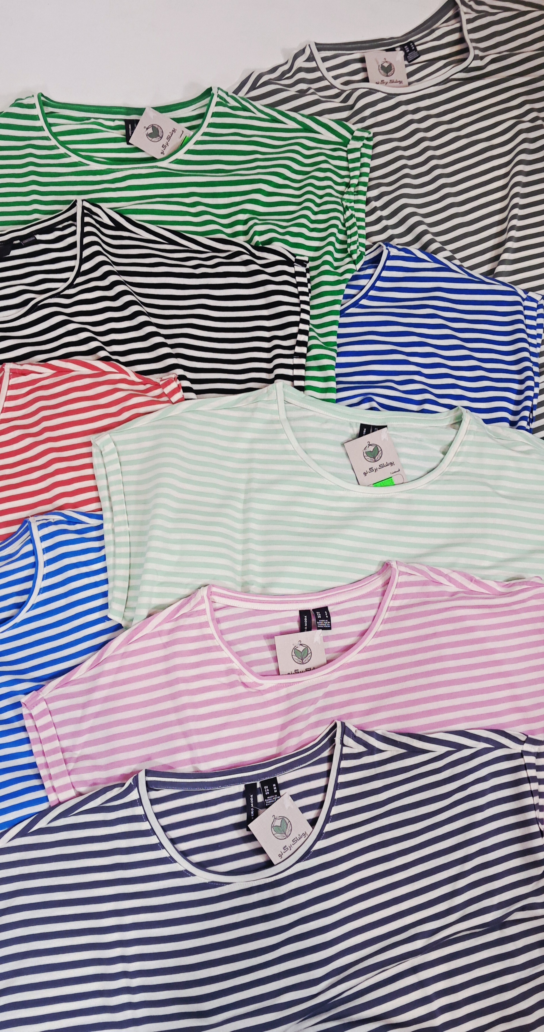 تیشرت راه راه نخ پنبه وارداتی برند VERO MODA مناسب تا سایز 44 جنس نخ پنبه محصول بنگلادش دارای سایز و رنگبندی پارچه ریزش دار یقه گرد دارای کشسانی و ریزش آستین سرخود